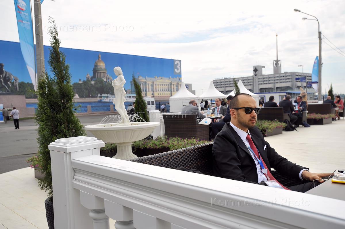 XVIII Петербургский Международного экономический форум (ПМЭФ) - 2014 в выставочном комплексе "Ленэкспо". Участники форума во время перерыва в уличном кафе.