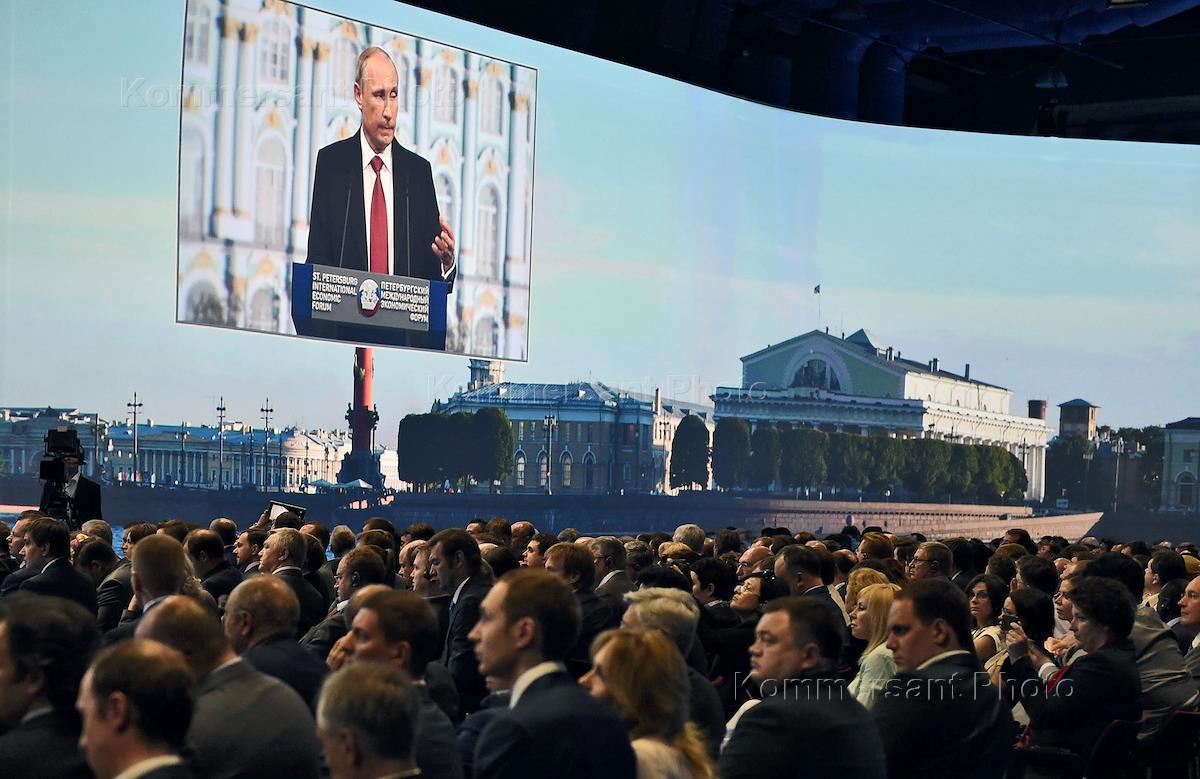 XVIII Saint-Petersburg International economic forum 2014 in Expoforum Kongress exhibition center. From left to right: President of United Co. Rusal Oleg Deripaska, president of Russian Railways company Vladimir Yakunin and chairman of Vnesheconombank corporation Vladimir Dmitriev before the meeting with Russian president Vladimir Putin with leaders of the summit.