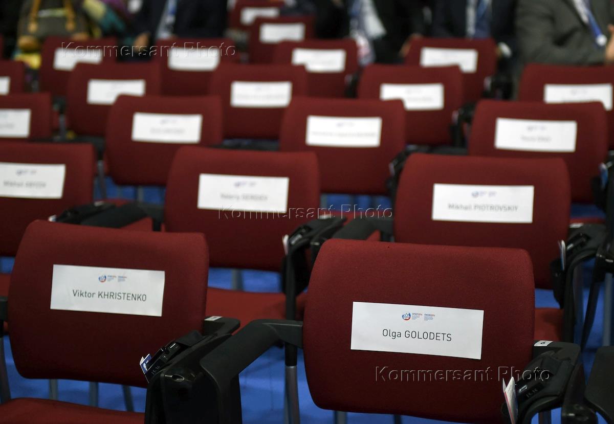 XVIII Saint-Petersburg International economic forum 2014 in Expoforum Kongress exhibition center. From left to right: President of United Co. Rusal Oleg Deripaska, president of Russian Railways company Vladimir Yakunin and chairman of Vnesheconombank corporation Vladimir Dmitriev before the meeting with Russian president Vladimir Putin with leaders of the summit.