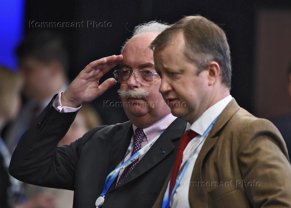 XVIII Saint-Petersburg International economic forum 2014 in Expoforum Kongress exhibition center. From left to right: President of United Co. Rusal Oleg Deripaska, president of Russian Railways company Vladimir Yakunin and chairman of Vnesheconombank corporation Vladimir Dmitriev before the meeting with Russian president Vladimir Putin with leaders of the summit.