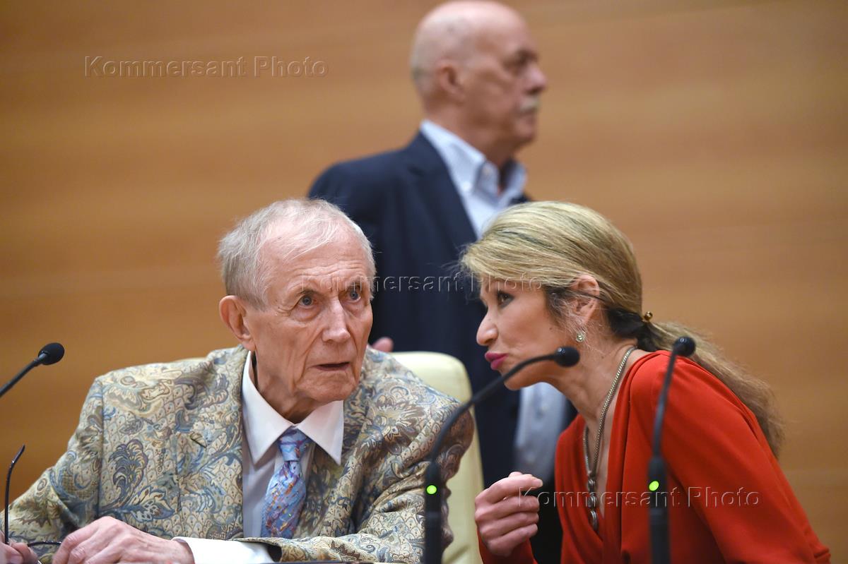 Председатель комитета Государственной думе России по культуре Станислав Говорухин (справа) перед началом лекции поэта Евгения Евтушенко (слева) в Государственной думе России.