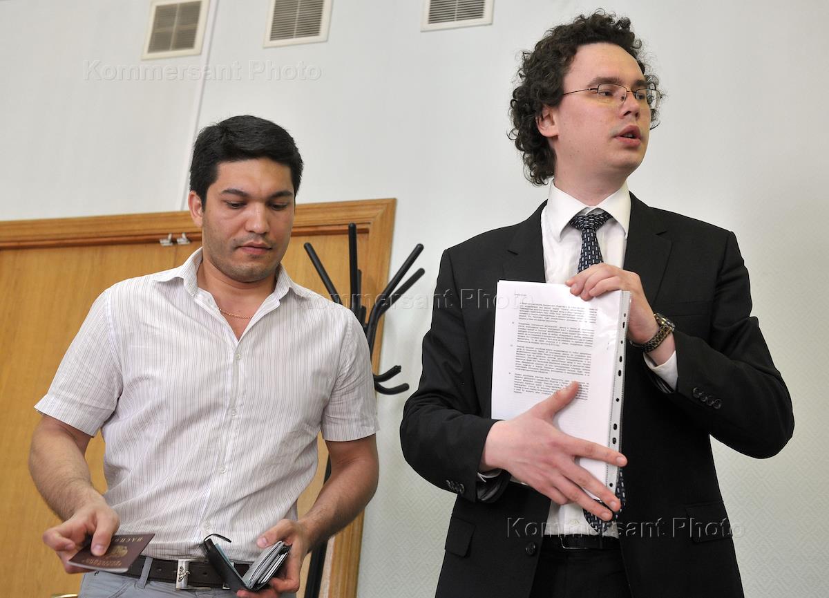 Эксперт центра "Мемориала" Фуркад Тишаев (слева) и главный юрист центра "Мемориала" Кирилл Коротеев (справа) во время рассмотрения иска правозащитного центра "Мемориал", оспаривающего прокурорские представления о нарушении им закона об иностранных агентах. Рассмотрение дела прошло в Замоскворецком районном суде.