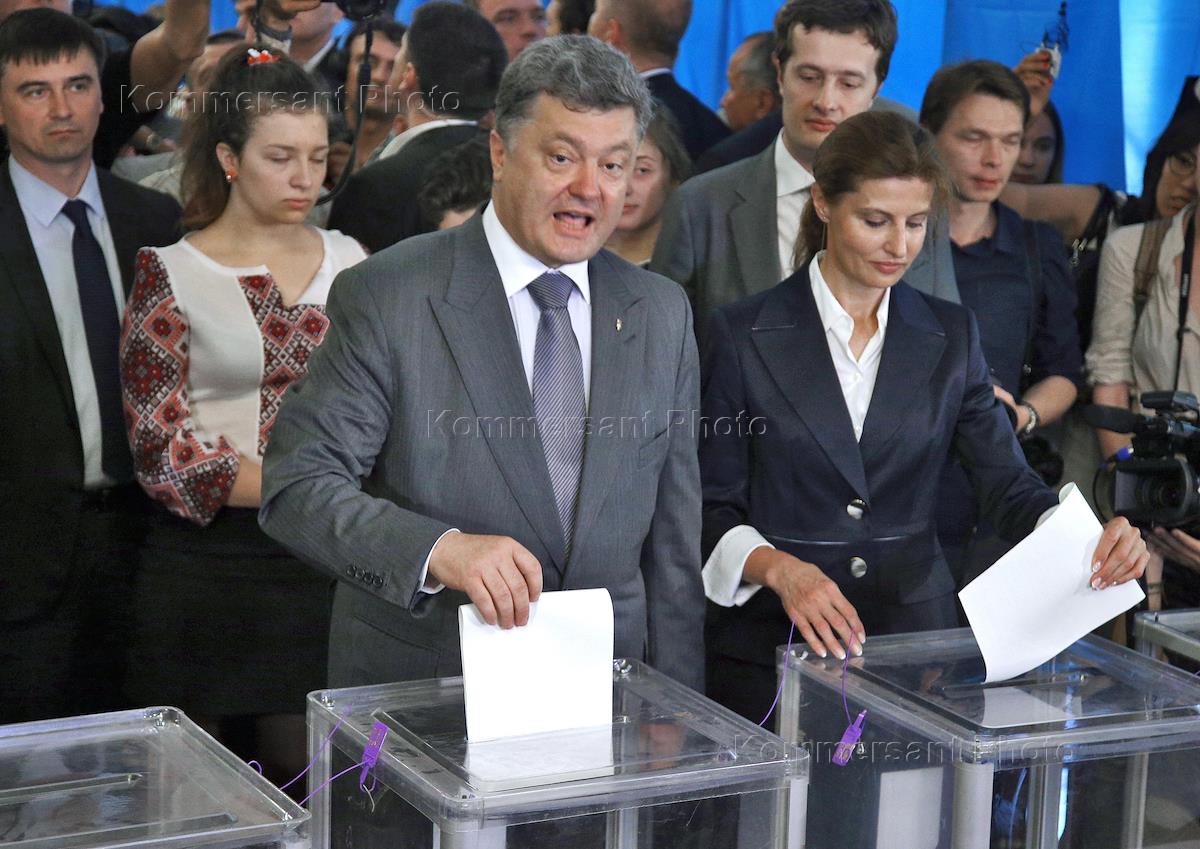 Досрочные выборы президента Украины. Кандидат на должность президента Украины Петр Порошенко с супругой Мариной во время голосования на одном из избирательных участков в Киеве.