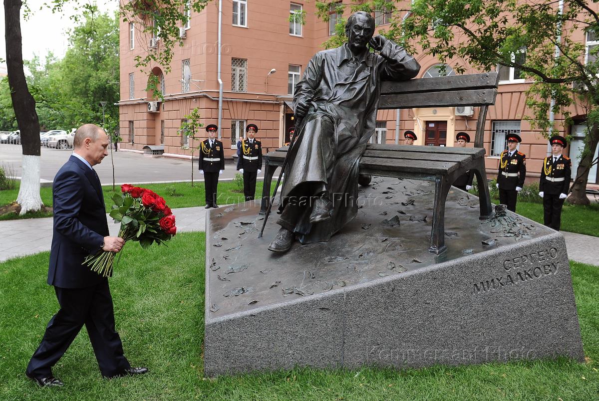 Президент России Владимир Путин открывает памятник писателю Сергею Михалкову на Поварской улице.