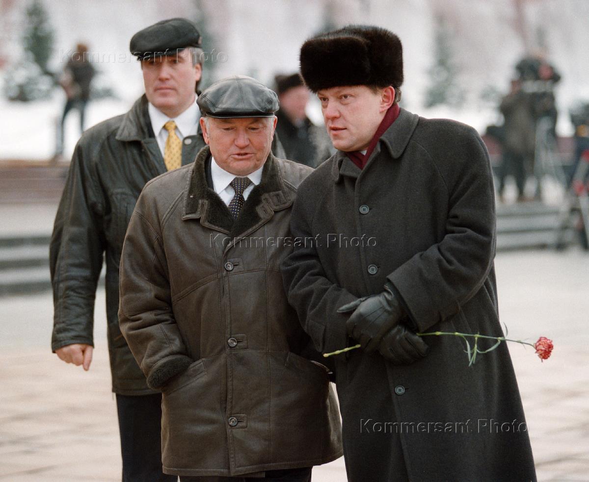 Moscow mayor Yuri Luzhkov (left) and leader of the state duma fraction Yabloka Gregory Yavlinsky (right) at the traditional laying of the wreath at the tomb of the unkown soldier.