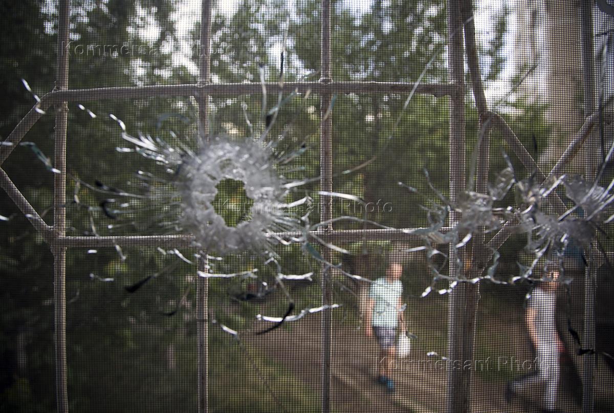 Политическая ситуация на Украине. Простреленные окна в квартире дома, пострадавшие в ходе боев на пограничной заставе Луганска 2 мая 2014 года.