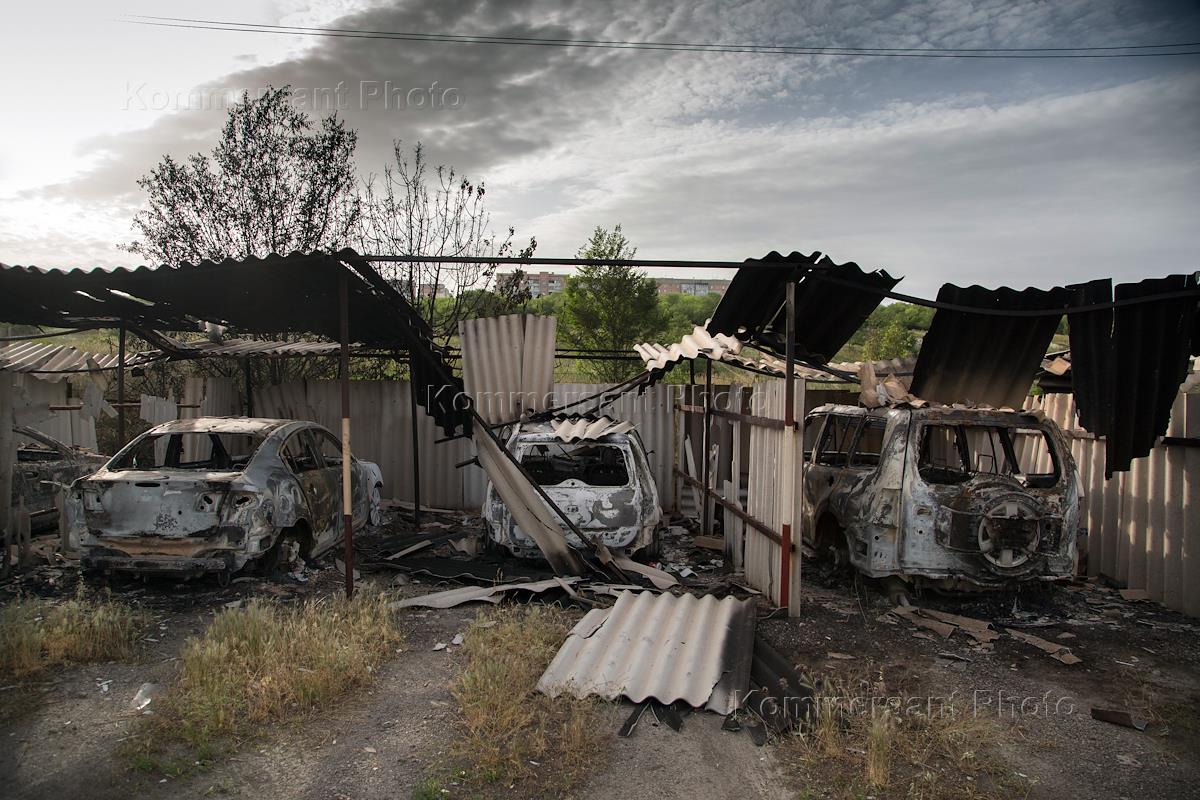 Политическая ситуация на Украине. Автовокзал в Донецке. Сожженные автомобили, пострадавшие в ходе боев на погранзаставе города Луганска 2 мая, погранзастава в луганске, пострадавшая в ходе боев 2 мая, луганская обладминистрация.