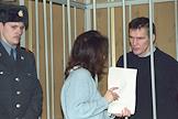 State Duma Foreign Affairs Committee Staff Manager Vladimir Trofimov (right) talks to his lawyer (centre) during a break in the Moscow City Court session. Vladimir Trofimov was sentenced to nine years in prison and confiscation of his property for bribery.
