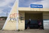 Политическая ситуация на Украине. Люди на автобусной остановке у села покидают Изварино в Луганской области. Надпись на стене "Смерть хунте!".