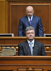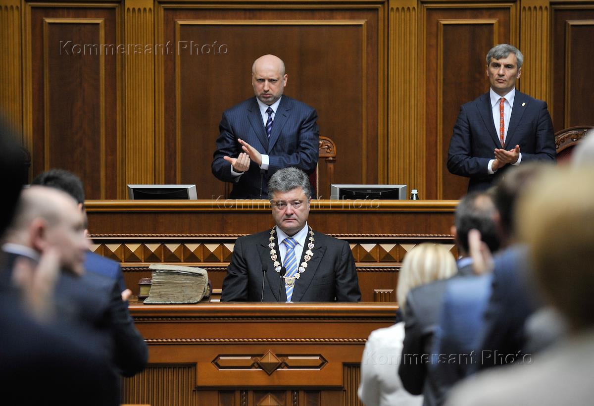 Инаугурация президента Украины Петра Порошенко прошла в Верховной Раде Украины. Спикер Верховной рады Александр Турчинов (слева) и президент Украины Петр Порошенко (в центре) во время инаугурации.