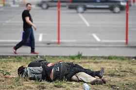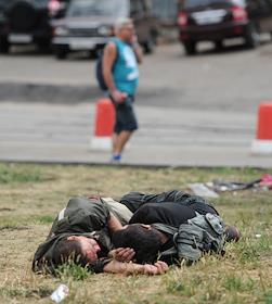 Жанровая фотография. Мужчины-бомжы спят на газоне.