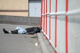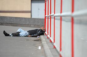 Жанровая фотография. Мужчина-бомж спит на улице.