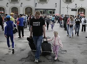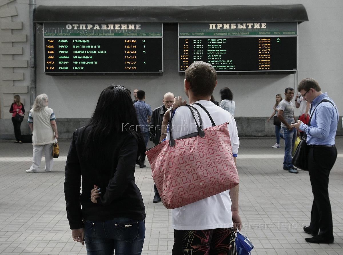 Виды Казанского вокзала. Пассажиры на платформе у расписания движения поездов.