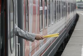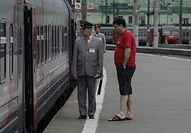 Виды Казанского вокзала. Проводник на платформе у вагона поезда "Москва - Новороссийск".