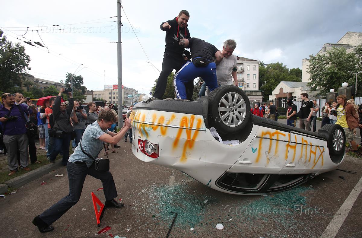 Акция протеста у здания посольства России в Киеве. Участники протеста переворачивают автомобиль работников посольства.