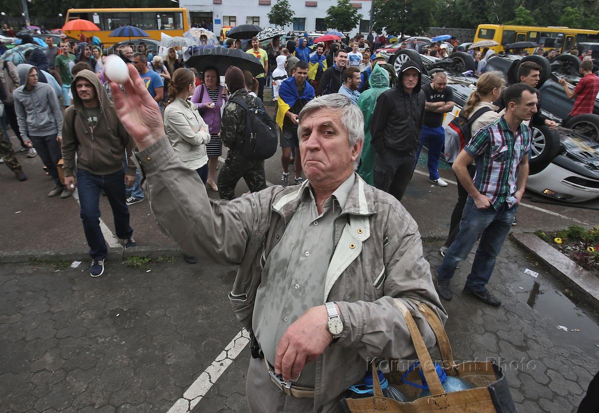 Акция протеста у здания посольства России в Киеве. Участники акции с топором ломают автомобиль.