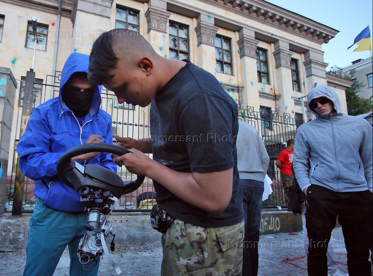 Акция протеста у здания посольства России в Киеве. Участники протеста держат руль с разрушенного автомобиля работников посольства.