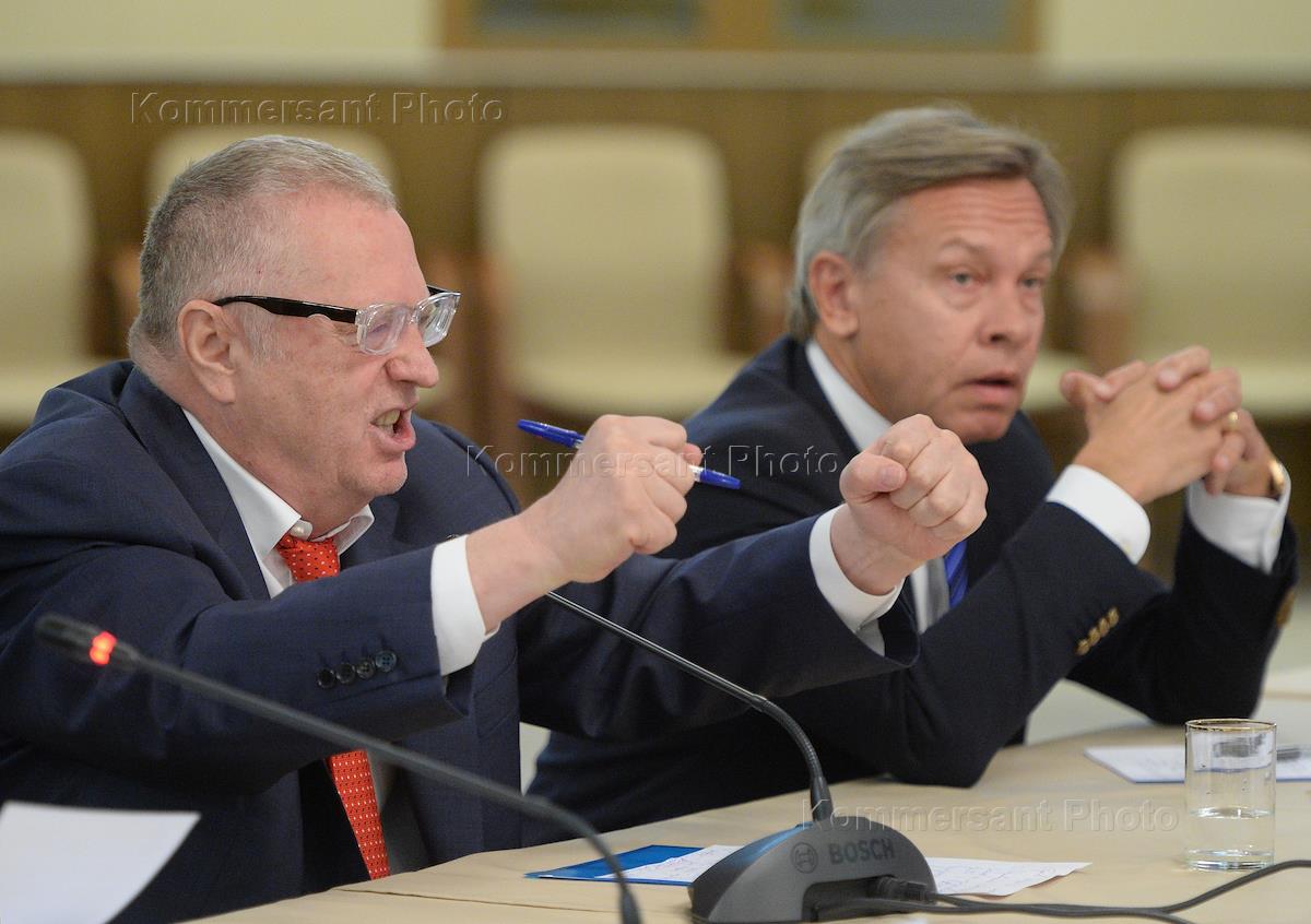 Заседание "Открытой трибуны" на тему "Современная архитектура безопасности и международное право прошло в Государственной думы России. Лидер Либерально-демократической партии России (ЛДПР), член комитета ГД по обороне Владимир Жириновский (слева) и председатель комитета Государственной думы России по международным делам Алексей Пушков на заседании в Госдуме России.
