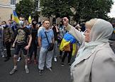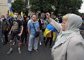 Верующая УПЦ МП (московского патриархата) перед входом в Киево-Печерскую лавру крестит протестующих национал-патриотов.