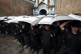 Сотрудники милиции укрылись от дождя щитами во время дежурства у центрального входа в Киево-Печерскую лавру, где должен пройти крестный ход "За мир на Донбассе".