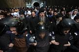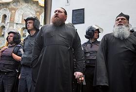 Священники УПЦ МП (московского патриархата) поют молитвы перед входом в Киево-Печерскую лавру, у которого молодые люди под украинскими флагами и флагами "Правого сектора" провели пикет.