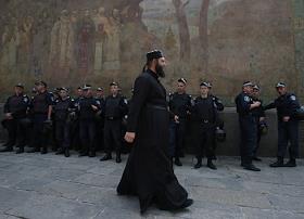 Сотрудники милиции во время дежурства у центрального входа в Киево-Печерскую лавру, где должен пройти крестный ход "За мир на Донбассе".