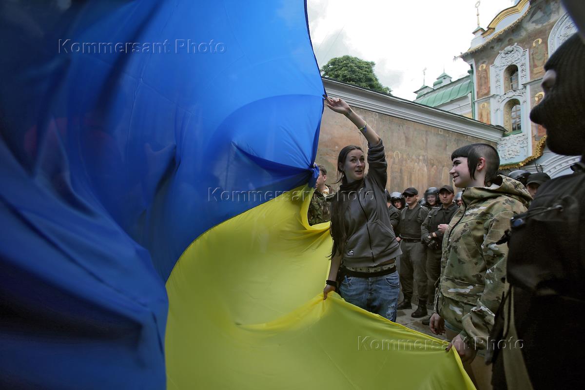 Протестующие национал-патриоты возле входа в Киево-Печерскую лавру развернули государственный флаг Украины. В этот день несколько сотен молодых людей под украинскими флагами и флагами "Правого сектора" отправились пикетировать Киево-Печерскую лавру, в которой, по их информации, якобы будут создавать "Киевскую народную республику".