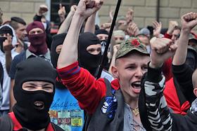 Протестующие национал-патриоты возле входа в Киево-Печерскую лавру. В этот день несколько сотен молодых людей под украинскими флагами и флагами "Правого сектора" отправились пикетировать Киево-Печерскую лавру, в которой, по их информации, якобы будут создавать "Киевскую народную республику".