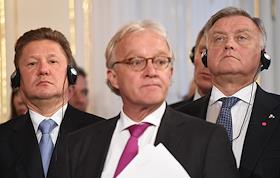 Рабочая поездка президента России Владимира Путина в Австрию. Пресс-секретарь президента России Дмитрий Песков(справа), председатель правления компании "Газпром" (Россия) Алексей Миллер (в центре), помощник президента России Юрий Ушаков (справа) на церемонии подписания соглашений во дворце Хофбург в Вене.