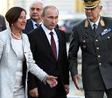 Рабочая поездка президента России Владимира Путина в Австрию. Министр МВД Австрии Йоханне Микль-Ляйтнер (слева) и президент России Владимир Путин (второй справа) после завершения российско-австрийских переговоров.