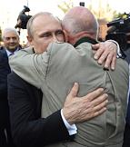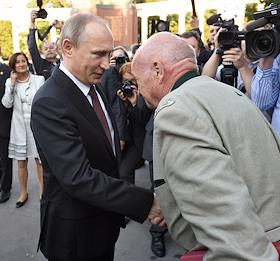 Рабочая поездка президента России Владимира Путина в Австрию. Президент России Владимир Путин (слева) и активист историко-мемориальной работы, автор Книги памяти "Советские граждане, погибшие в Австрии в годы Второй мировой войны, и места их захоронения" Петер Сиксль (справа) во время церемонии возложения венка к памятнику советским воинам, погибшим при освобождении Австрии от фашизма.
