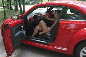 Корреспондент издательского дома (ИД) "Коммерсантъ" Евгения Милова во время проведения тест-драйва автомобиля Volkswagen Beetle (Фольксваген Битл).