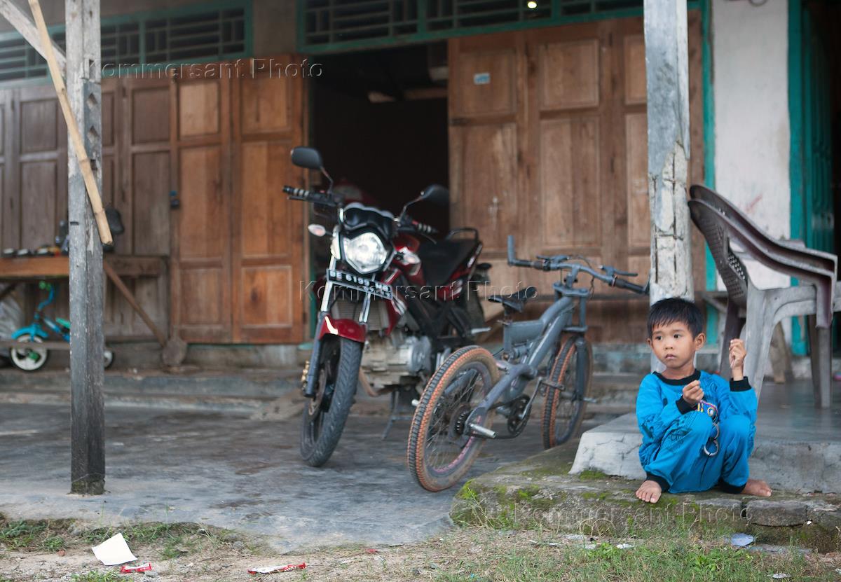 Деревня у подножия действующего вулкана Демпо (Dempo). Мальчик на пороге дома.