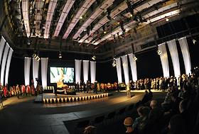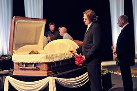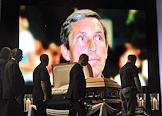 Генеральный директор Первого канала Константин Эрнст (справа второй) и первый заместитель руководителя администрации президента России Алексей Громов (справа) во время церемонии прощания с погибшим на Украине оператором Первого канала Анатолием Кляном в первой студии телецентра Останкино.