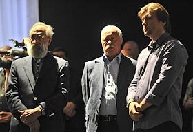 Представитель в Совете Федерации России от исполнительного органа государственной власти Тульской области Артур Чилингаров, телеведущий Леонид Якубович, руководитель Дирекции информационных программ Первого канала Кирилл Клейменов во время церемонии прощания с погибшим на Украине оператором Первого канала Анатолием Кляном в первой студии телецентра Останкино.