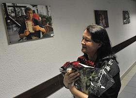 Вдова погибшего на Украине оператора Первого канала Анатолия Кляна на церемонии прощания в первой студии телецентра Останкино.