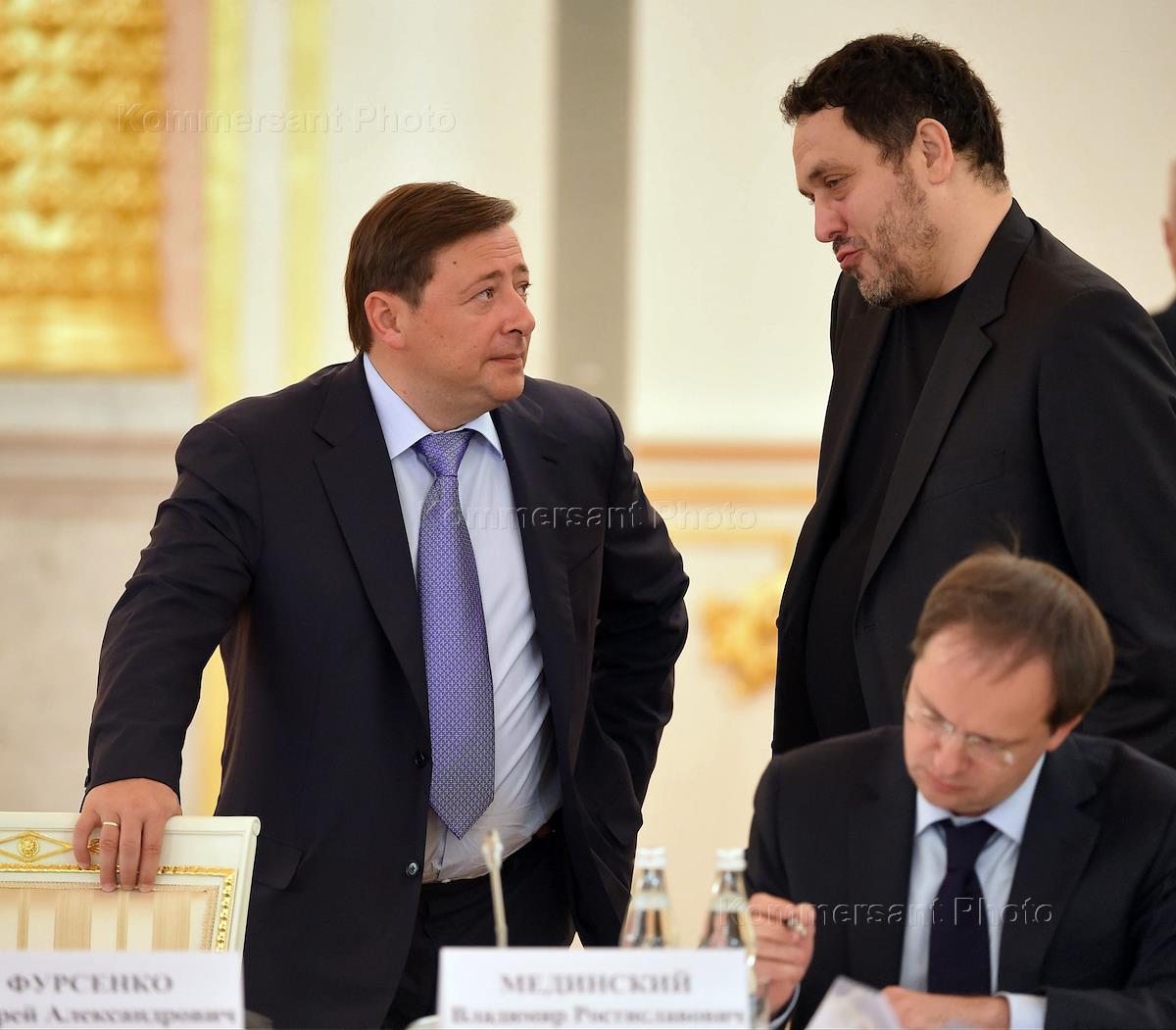 Помощник президента России Андрей Фурсенко (слева) и советник президента России по культуре Владимир Толстой (в центре) на заседании Совета по межнациональным отношениям. Заседание прошло в Кремле.