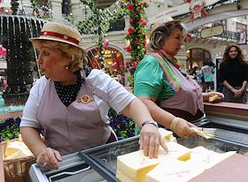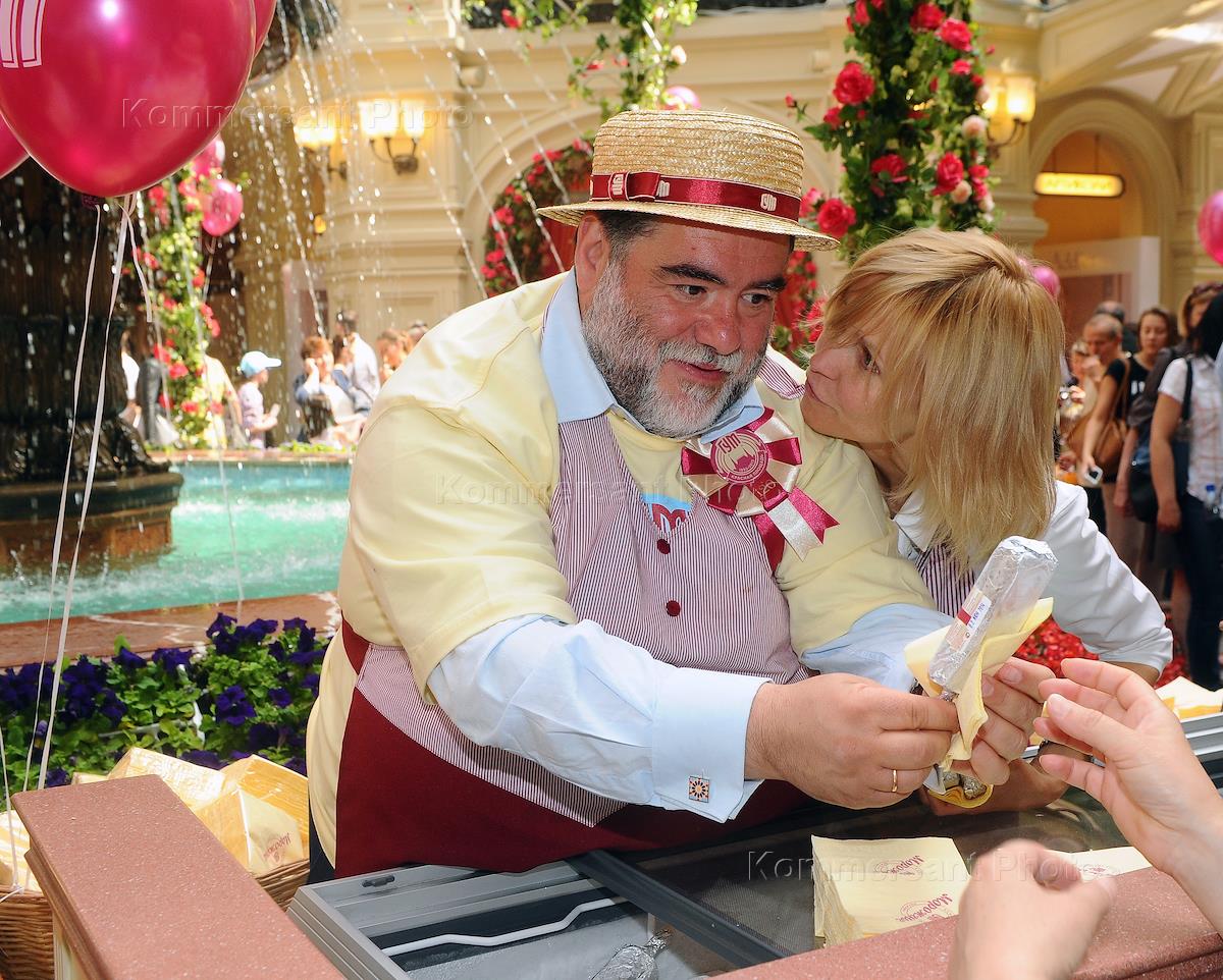 Писатель, поэтесса Лариса Рубальская (cлева) и управляющий директор ОАО "Торговый Дом ГУМ" Теймураз Гугуберидзе (справа) на праздновании Дня мороженого в ГУМе.