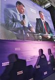 Конференция крымского регионального отделения партии "Единая Россия" прошла в Симферополе. Председатель Государственного Совета Крыма Владимир Константинов (слева на экране) и исполняющий обязанности главы Республики Крым Сергей Аксенов (справа на экране) во время выдвижения кандидатов на выборы в Госсовет.