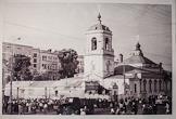 Фотография храма Преображения Господня на Преображенской площади. Храм перед сносом - редкий снимок, сделан в июле 1964 г, виден забор, которым огородили перед взрывом, и верующие, окружившие храм.