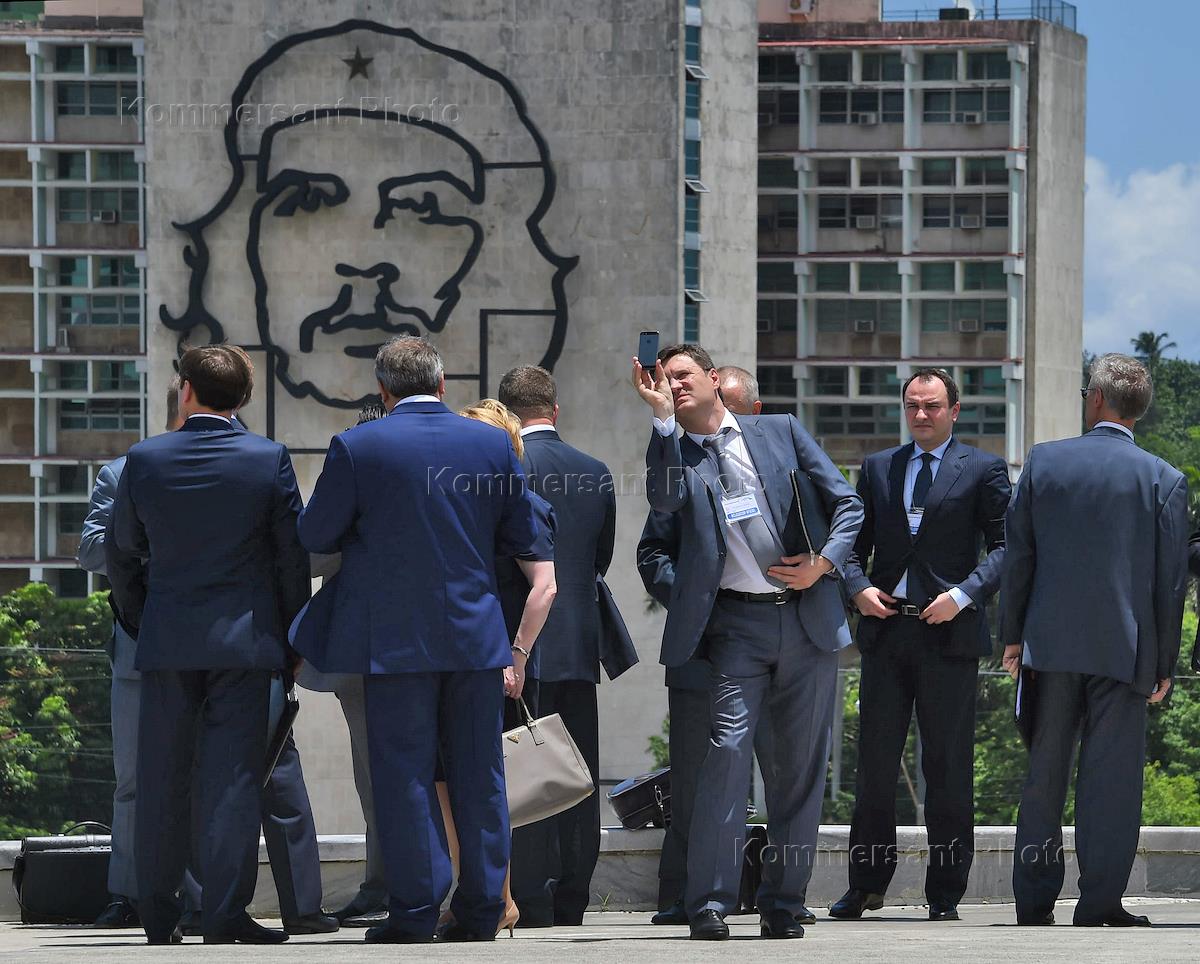 Рабочий визит президента России Владимира Путина на Кубу. Российская делегация перед церемонией возложения венка к памятнику национальному герою Хосе Марти на площади Революции в Гаване.