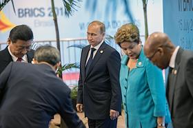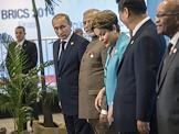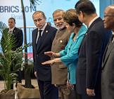 VI саммит БРИКС. Cлева направо: президент России Владимир Путин, премьер-министр Индии Нарендра Моди, президент Бразилии Дилма Роуссефф, председатель Китайской Народной Республики Си Цзиньпин, президент Южно-Африканской Республики (ЮАР) Джейкоб Зума во время встречи в Конгресс-центре.