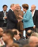 VI саммит БРИКС. президент Бразилии Дилма Роуссефф (слева), президент России Владимир Путин (в центре), председатель Китайской Народной Республики Си Цзиньпин (справа) перед началом пленарного заседания саммита БРИКС в Конгресс-центре.