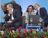 VI саммит БРИКС. Слева направо: заместитель руководителя администрации президента России, пресс-секретарь президента Дмитрий Песков, помощник президента России Юрий Ушаков, председатель Центрального банка России Эльвира Набиуллина, президент России Владимир Путин, министр иностранных дел России Сергей Лавров и министр финансов России Антон Силуанов во время пленарного заседания саммита БРИКС в Конгресс-центре.