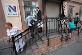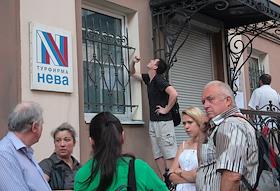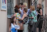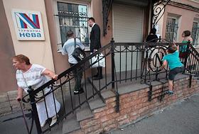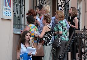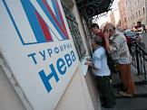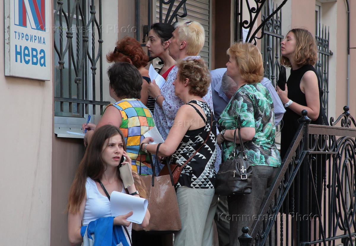 Клиенты туристической фирмы "Нева" у дверей офиса туроператора на 1-ой Советской улице.