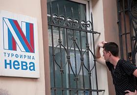 Клиент туристической фирмы "Нева" у дверей офиса туроператора на 1-ой Советской улице.