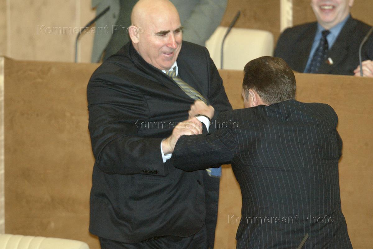 Депутат Государственной Думы России, член фракции КПРФ Василий Шандыбин (слева) дерется с заместителем председателя комитета Государственной Думы по законодательству Александром Федуловым во время пленарного думского заседания.