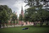 Жара в Москве. Молодой человек отдыхает на газоне недалеко от Кремля.