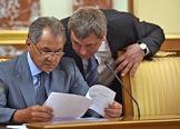 Министр обороны России Сергей Шойгу (слева) и министр регионального развития России Игорь Слюняев (справа) на заседании правительства России.
