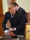 Заседание правительства России. Слева направо: министр энергетики России Александр Новак, министр России по делам Северного Кавказа Лев Кузнецов и министр строительства и жилищно-коммунального хозяйства России Михаил Мень перед началом заседания.